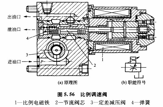 圖5.56所示為比例調速閥的結構原理圖。與普通調速閥相比,其主要區別是用直流比例電磁鐵取代了手柄對節流閥的控制。比例電磁鐵1的輸出力作用在節流閥芯2上,與彈簧力、液動力、摩擦力相平衡,對應一定的控制電流,對應一定的節流開度。通過改變輸入電流的大小,即可改變通過調速閥的流量。