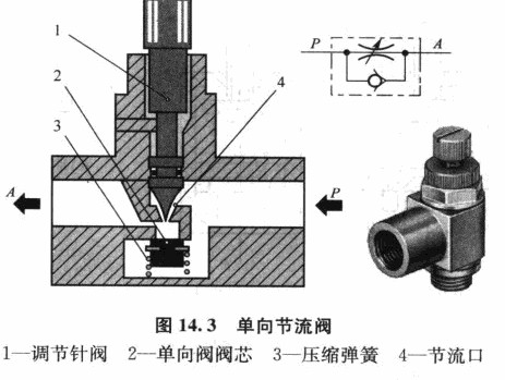 排氣節流閥是裝在執行元件的排氣口處,通過調節排入大氣的流量,以改變執行元件的運動速度的一種控制閥。它常帶有消聲器件,以降低排氣噪聲,并能防止外部環境通過排氣孔污染氣路中的元件。圖14.4所示是排氣節流閥的工作原理圖。