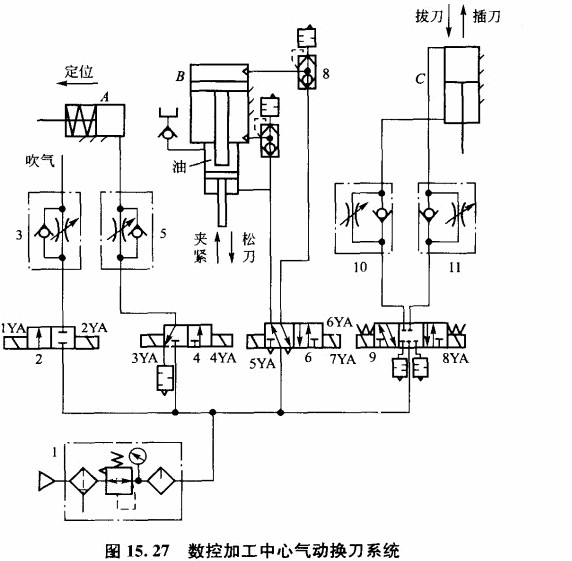 9、單向節流閥11進入缸C的上腔,缸C下腔排氣,活塞下移實現拔刀。自回轉刀庫交換刀具,同時lYA通電,壓縮空氣經換向閥2、單向節流閥3向主軸錐孔吹氣。稍后lYA斷電、2YA通電,停止吹氣, 8YA斷電、7YA通電,壓縮空氣經換向閥9、單向節流閥10進入缸C的下腔,活塞上移,實現插刀動作。6YA斷電、5YA通電,壓縮空氣經閥6進入氣液增壓氣B的下腔,使活塞退回,主軸的機械機構使刀具夾緊。4YA斷電、3YA通電,缸A的活塞在彈簧力作用下復位,恢復到開始狀態,換刀結束。