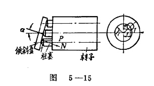 軸向柱塞泵和軸向柱塞馬達在結構上是相似的。軸向柱塞馬達的工作原理見圖5-15,F以帶有傾斜盤的液壓馬達為例,說明其工作原理s處在進油腔的柱塞受到液壓力時,向左頂出。同時,傾斜盤對柱塞有一反作用力N,該力垂直斜盤平面,并可以分解為兩個分力t一個為軸向分力P,它和柱塞所受的液壓力平衡s另一力T與柱塞軸線垂直,官使轉子產生扭矩。假如認為馬達的排油腔壓力可以忽略不計,液壓馬達的輸出扭矩,就成為進油腔所有桂塞產生的扭矩之利。