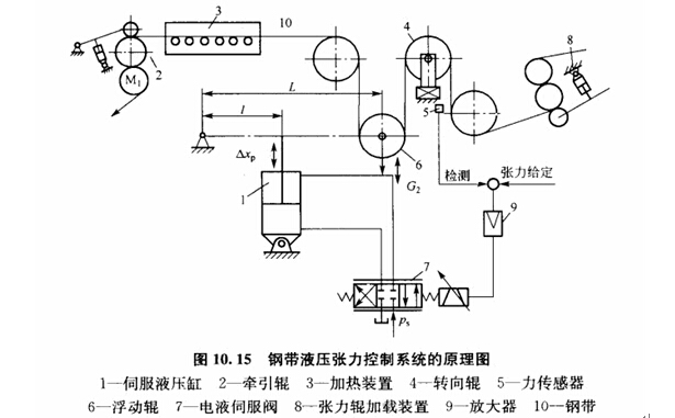 在帶鋼生產過程中,為了保證鋼帶的質量,常要求控制帶材的張力,為此,常用伺服系統來實現恒張力控制。圖10.15所示為鋼帶張力控制系統的原理圖,2為牽引轆,8為張力輥加載裝置,它們便鋼帶具有一定的張力。但由于種種原因,張力可能有波動,為此需在轉向輯4的軸承上設置力傳感器5,以檢測帶材的張力,并用伺服液壓缸1帶動浮動轆6來調節張力。如果實際張力與給定值相等,則偏差信號為零,