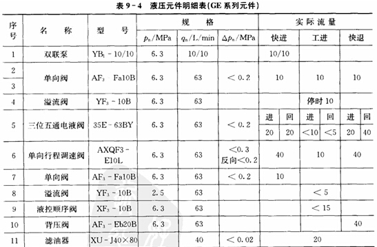 接通過各元件的最大流量選擇液壓元件的規格,見表9-4。