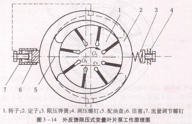 單作用式葉片泵的變量方法是改變其偏心距e的大小,偏心距可通過手動(dòng)調(diào)節(jié),也可自動(dòng)調(diào)節(jié)。自動(dòng)調(diào)節(jié)的變量泵可根據(jù)其工作特性的不同分為限壓式、恒壓式和恒流量式三類,其中以限壓式應(yīng)用較多。