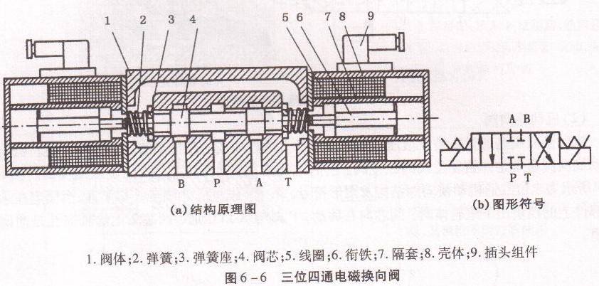 如圖6 -6(a)所示為三位四通電磁換向閥的結構原理圖。閥的兩端各有一個電磁鐵和一個對中彈簧。閥芯在常態時處于中位。當右端電磁鐵通電時,右銜鐵6通過推桿將閥芯4推至左端,閥右位工作,其油口P通B,A通T;當左端電磁鐵通電時,閥芯移至右端,閥左位工作,油口P通A, B通T。圖6 -6(b)為三位四通電磁換向閥的圖形符號。