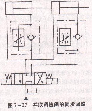 如圖7 -27所示,用兩個調速閥分別串接在兩個液壓缸的回油路(進油路)上,再并聯起來,用以調節兩缸運動速度,即可實現同步。這也是一種常用的比較簡單的同步方法,但因為兩個調速閥的性能不可能完全一致,同時還受到載荷的變化和世漏的影響,同步精度較低。