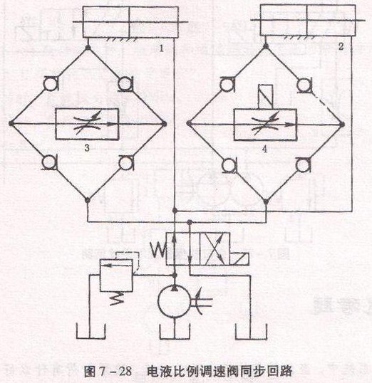 圖7-28所示為電液比例調速閥同步回路。該回路采用了一個普通調速閥和一個電液比例調速閥4,它們設置在由單向閥組成的橋式回路中,并分別控制液壓缸1和2的速度。